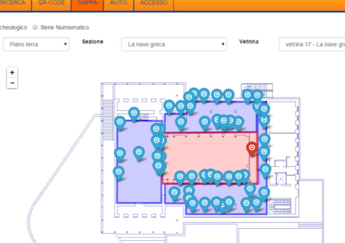 - Tramite la navigazione delle planimetrie del Museo. Selezionando sulla mappa il marker della sezione o della vetrina espositiva, l’utente accede alla lista di tutti i reperti esposti e catalogati nella sezione che sta visitando.