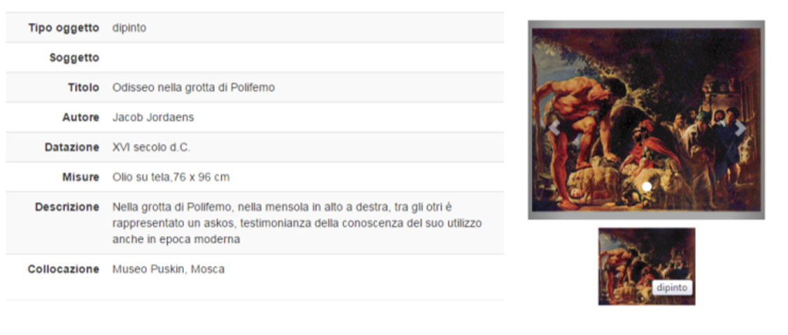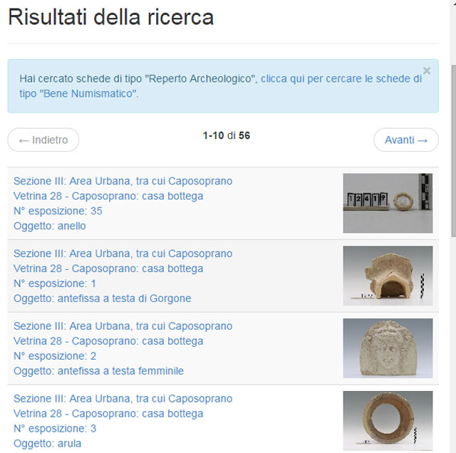 - Tramite maschera di ricerca. È possibile effettuare ricerche sugli attributi (liste, parole chiave, ecc.). L’utente può ricercare un particolare reperto o più reperti accomunati dalla stessa tipologia di oggetto o dalla stessa datazione.