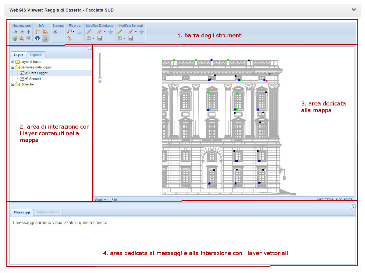 La sensoristica è stata scelta selezionando sul mercato quanto di meglio disponibile per piccole dimensioni, affidabilità nel tempo, elevata tecnologia e precisione nella rilevazione delle misure. Tutti i sensori, i cavi, ed ogni altro componente del sistema installato in facciata è stato inoltre ritoccato in opera a seguito dell’installazione così da scomparire praticamente alla vista. Il sistema dei sensori è stato integrato ad un sistema webGIS georiferito sugli ortofotopiani dei prospetti realizzati nell’ambito delle indagini sulle facciate. il sistema web permette l’accesso ai dati in modo sintetico ed analitico sia in formato grafico che tabellare con una serie di funzionalità di interrogazione ed analisi del dato.