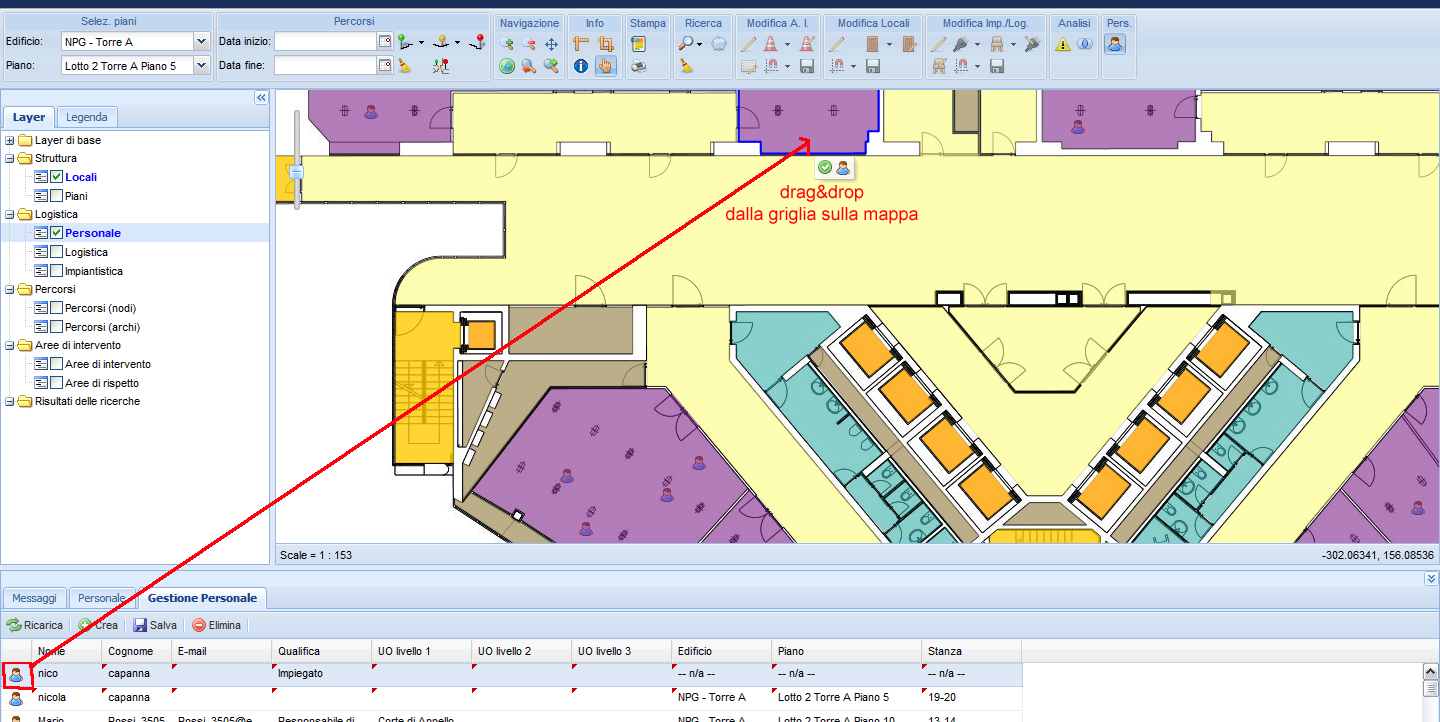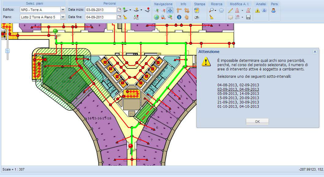 Con il supporto del sistema informativo, la logistica e la schedulazione temporale degli interventi possono essere programmati in modo ottimale rispetto alla tipologia di intervento e alla presenza simultanea di altri cantieri. Una funzionalità di routing debitamente adattata al contesto, permette l’individuazione di percorsi alternativi per il raggiungimento degli uffici o le vie di fuga in caso di presenza ostacoli dovuti all’allestimento dei cantieri o di momentaneo deposito di materiale sui regolari percorsi interni dell’edificio.